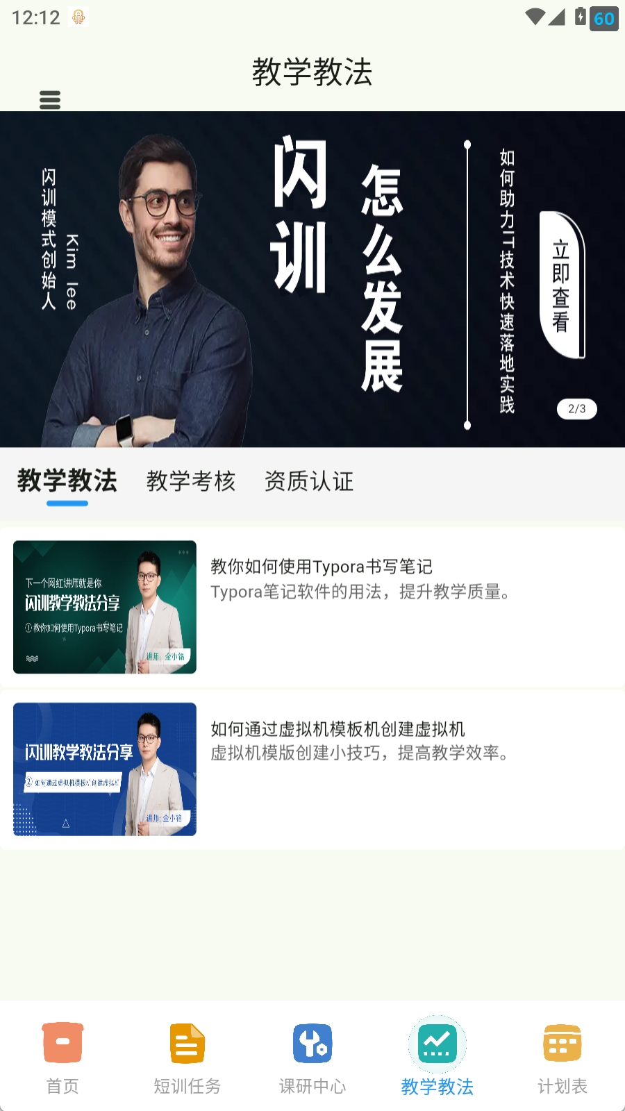 教学教法 主要为闪训平台为提高讲师的教学教法水平提供的视频教学、教学教法考核及讲师资质文件提供功能。